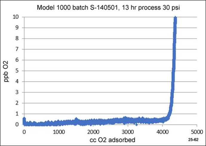 This example is for a filter that scrubbed 4 liters of oxygen from the gas stream at a low flow rate before the oxygen content of the effluent gas rose above 1 ppb.